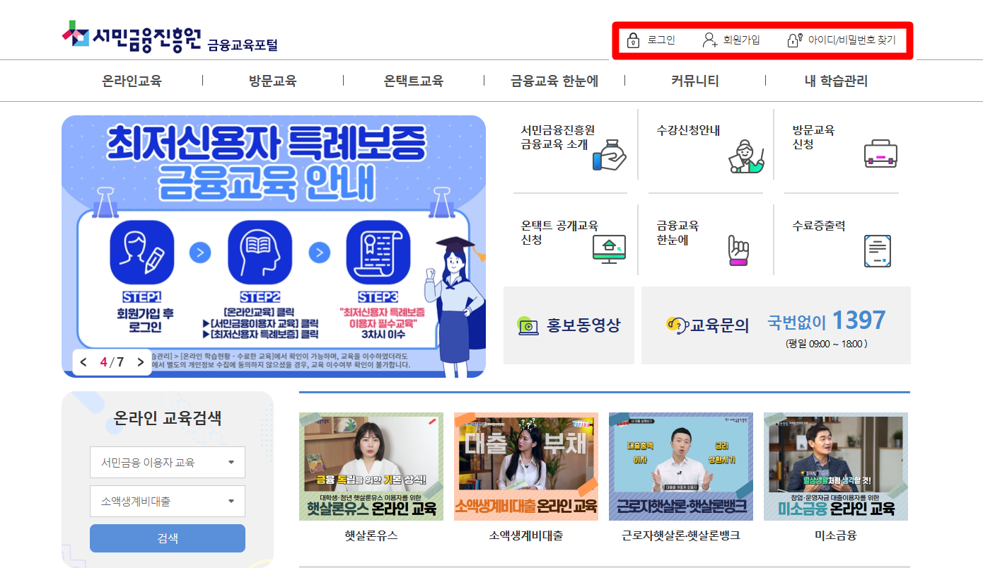 아래 링크를 클릭하셔서 서민금융진흥원 교육포털 사이트에서 원하시는 교육을 진행하시기 바랍니다.