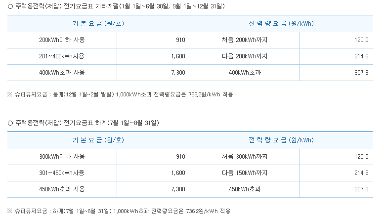 - 기본요금: 전기사용량과 관계없이 과금되는 고정된 요금으로, 구간별 구독 용량에 따라 차등화합니다.